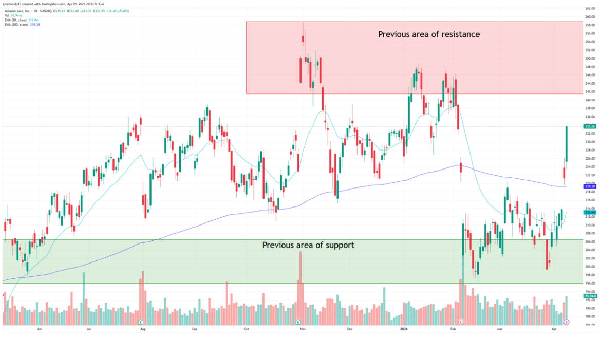 The most obvious support area sits lower, roughly between $196 and $206. That band held as a prior support zone and helped contain earlier weakness. If Amazon gives back some of the post-letter move, investors will likely look first to the 20-day and 200-day EMAs, then to that broader support band beneath them.